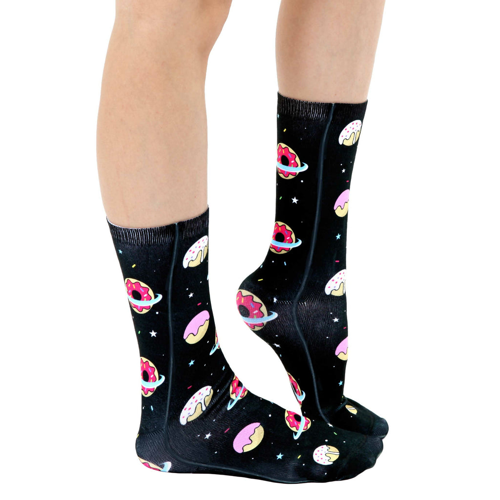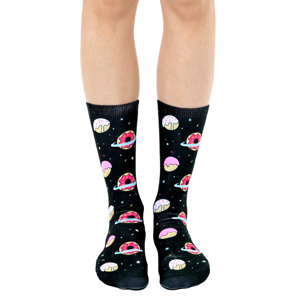 Get ready to blast off with these out-of-this-world Galaxy Donut socks! These novelty socks feature a hilariously sweet pattern of cartoonish doughnuts floating in a sea of planets on a black background. Wear these crew-length socks to add a touch of whimsy to your everyday style and show off your love for the cosmos and all things delicious. So, let your feet take a cosmic sugar rush and embrace the sweetness of the galaxy!