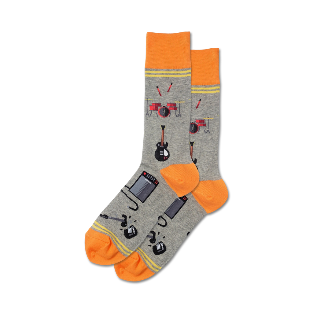 These Garage Band socks rock out loud! With their orange toes, heels, and stripes, and rad pattern of gray amps, black guitars, red drums, and orange keyboards, these mens crew socks will make you the star of any show. They're the perfect way to show off your musical spirit and let your feet do the talking! If you want to be in the band or in the stands, Garage Band has you covered.