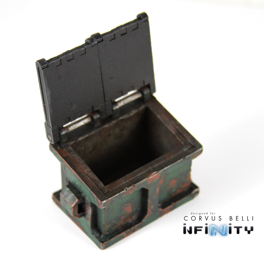 Garbage dumpster, recycling bin, perfect hiding place. Whatever you want to call it this MDF piece is a great piece of terrain. Blocks line of sight and is sized to scale allowing a miniature to fit inside.