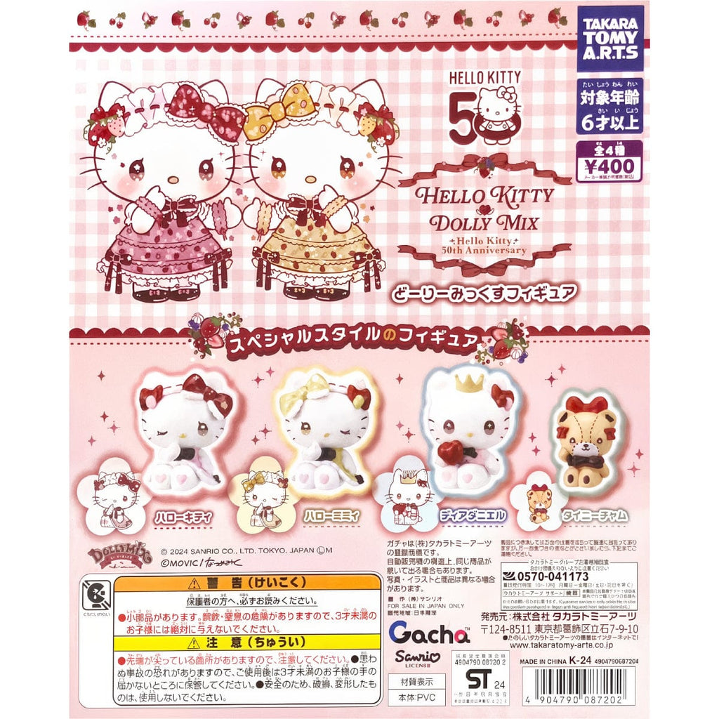 4 Adorable Variants – Collect Hello Kitty, Mimmy, Dear Daniel, and Tiny Chum in soft pastel Dolly Mix dresses—each figure is an exclusive design from Takara Tomy Arts Japan.