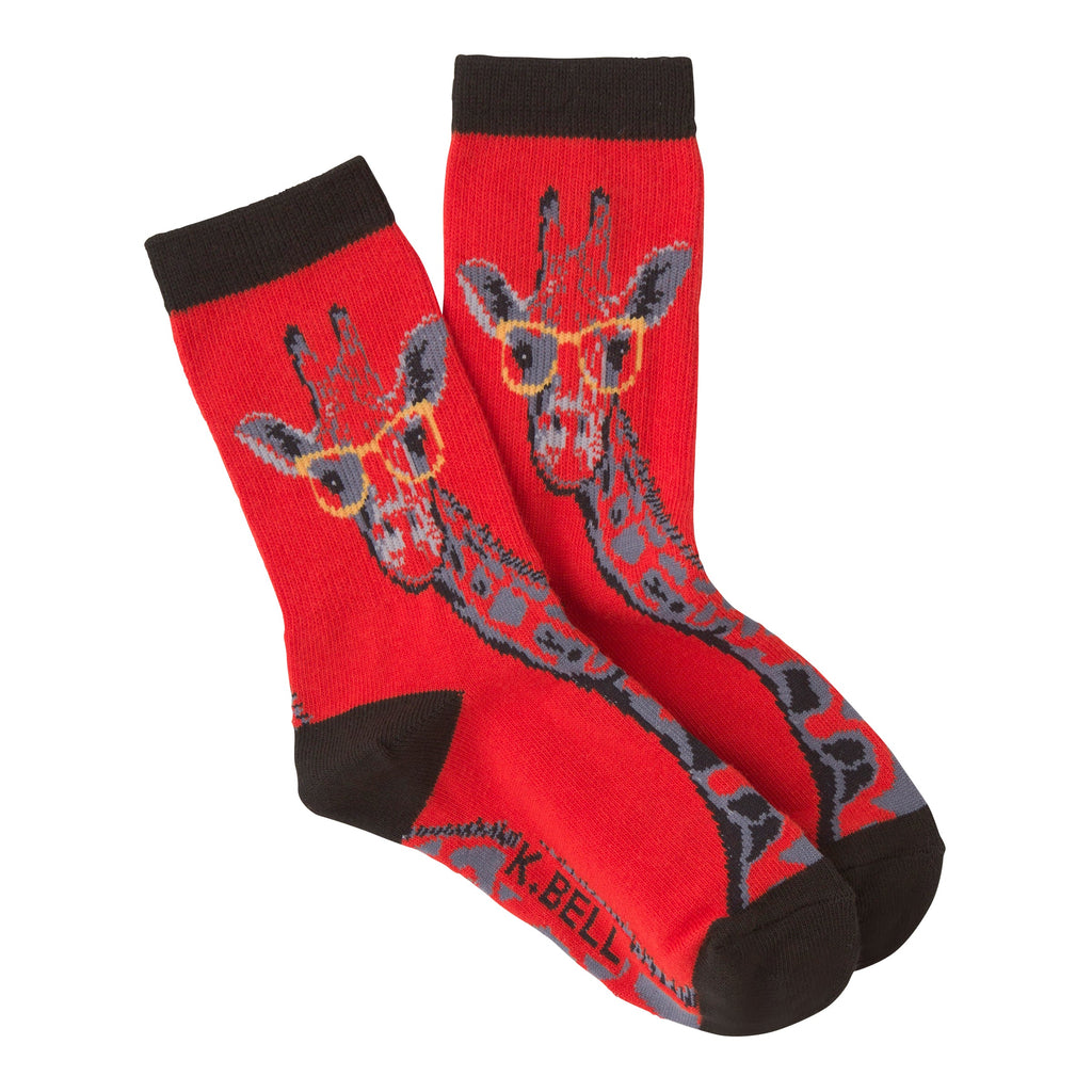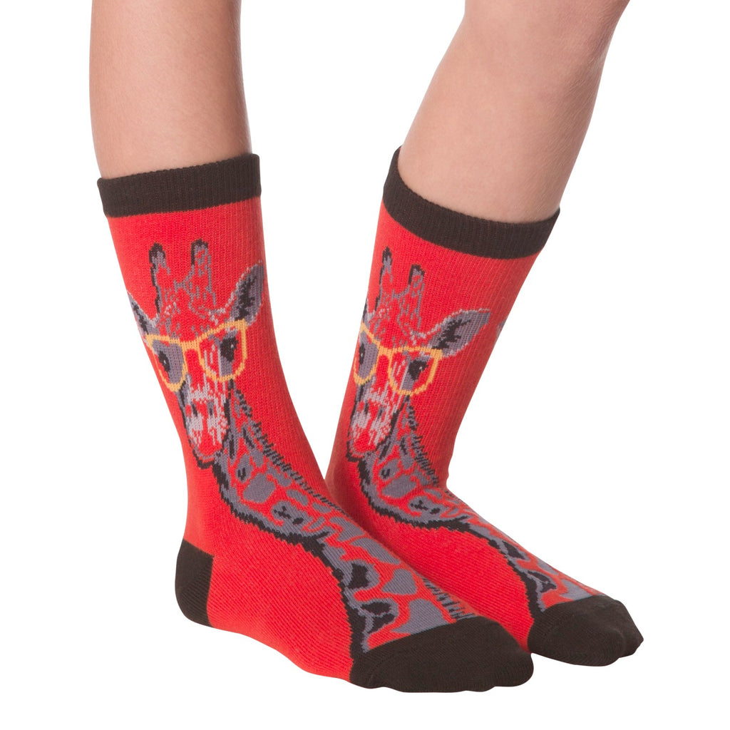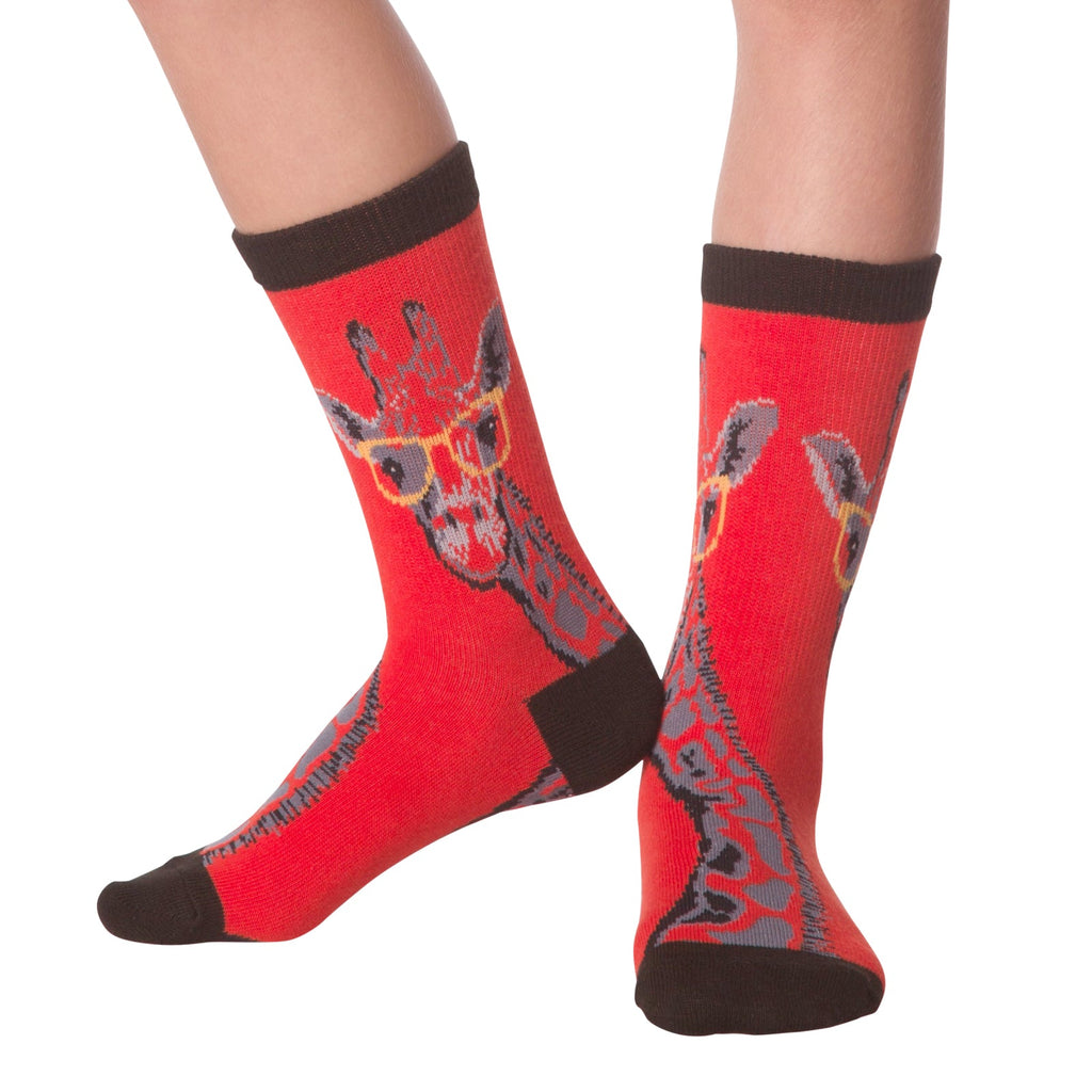 These aren't your average socks. Check out these 'Giraffe with Glasses' crew socks – a vibrant red with a fun pattern. A giraffe's head, sporting some seriously stylish specs, is prominently featured. The rest of the giraffe's neck and part of its body extend down the sock in gray and red. The cuff is a dark brown. They're comfy, they're cute, and they're guaranteed to start a conversation. Who needs boring feet?