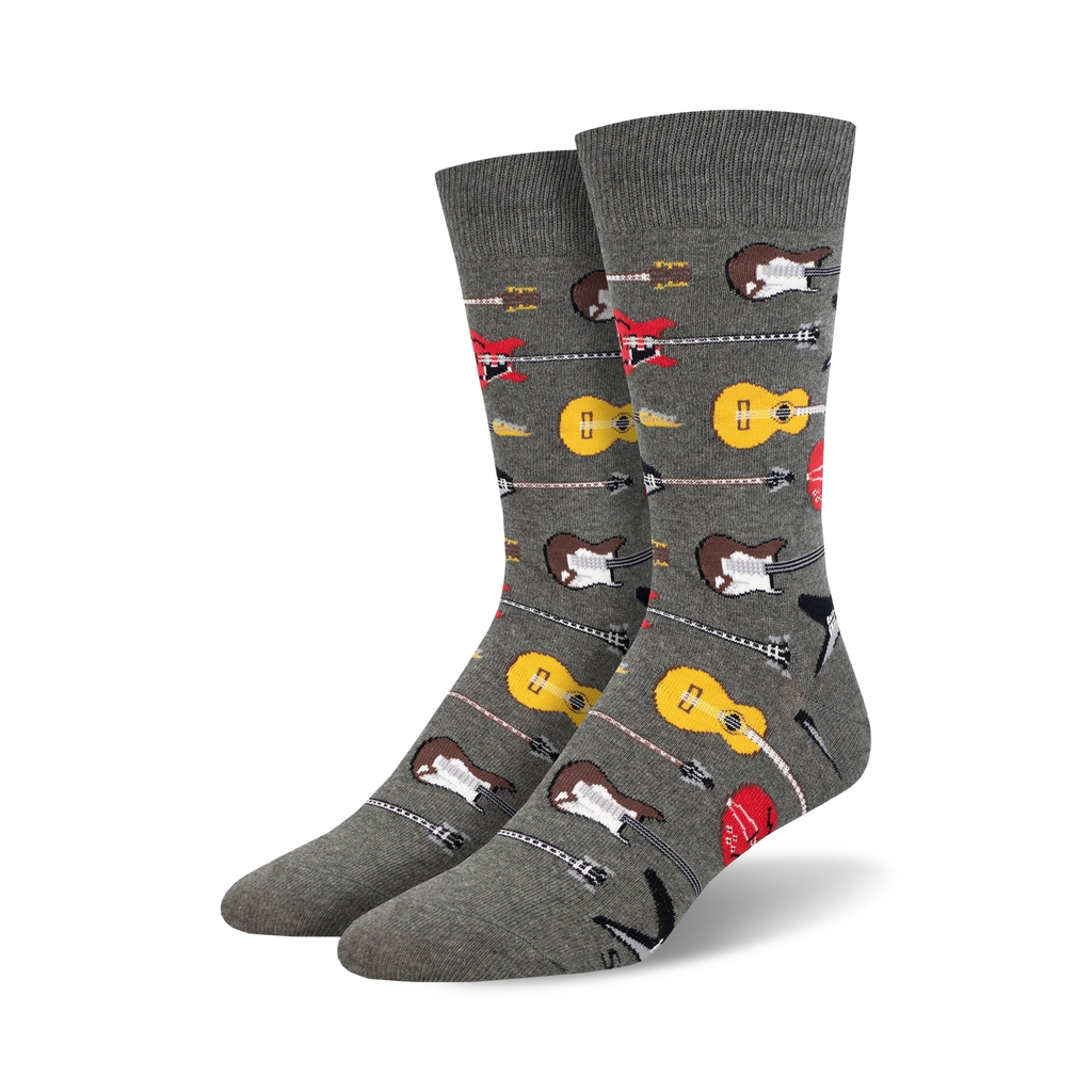 These gray guitar riff socks with a pattern of guitars in red, yellow, brown, white, and black are made for men and are crew length. Fun fact: The six-string guitar that we all know today was invented in Spain in the 1850s, although guitars have been around since at least the 15th century. Play your next air guitar solo wearing these rockin socks.