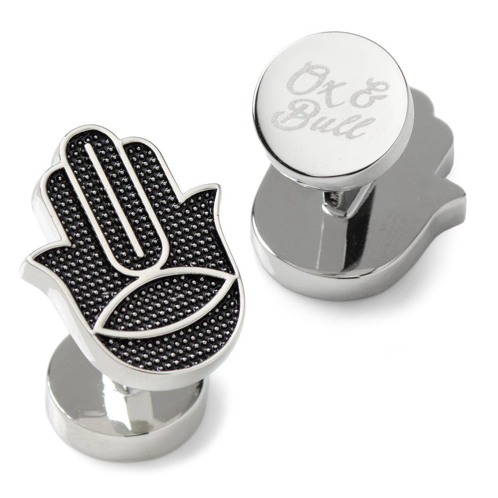A blend of ancient symbolism and contemporary elegance, our Hamsa Textured Silver Cufflinks feature the iconic Hamsa hand found in both Islam and Judaism. Renowned for its protective qualities, blessings of good fortune, and intricately textured in lustrous silver plated base metal, these cufflinks add a touch of spiritual sophistication to any ensemble. The expert craftsmanship of our base metal cufflinks ensures long-lasting durability.