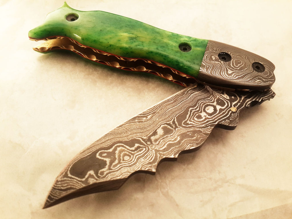 Handle Made Of Green Colour Bone And Damascus Bolsters