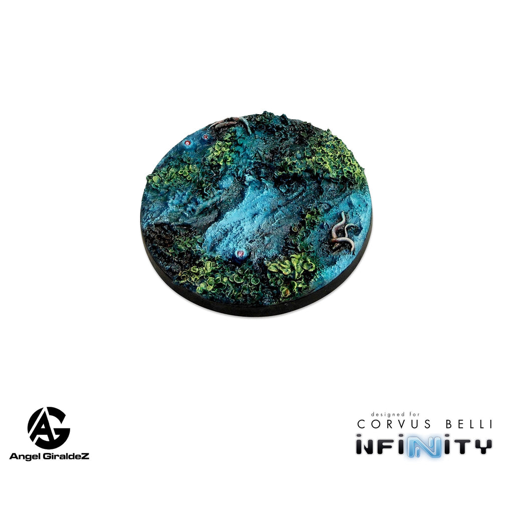 Combined Army-themed Harbinger resin bases designed by Angel Giraldez! This set is designed in an alien landscape style for Infinity the Game.