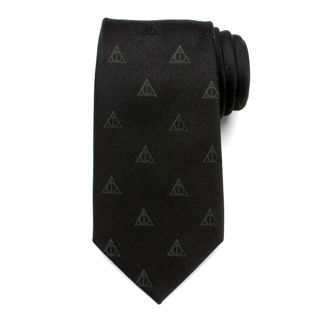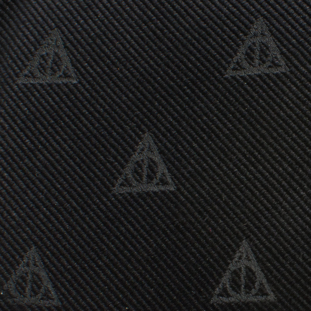 The Deathly Hallows Tie is woven with 100% silk in a sleek monochromatic black design. Recognized by any Harry Potter fan, the Deathly Hallows symbol is composed of three elements that represent the three items that, if held by the same wizard, can make the user the Master of Death: the Cloak of Invisibility (Triangle), the Resurrection Stone (Circle), and the Elder Wand (Line).
