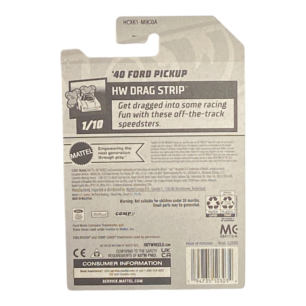 This model is part of the Drag Strip Series, specifically designed for fans who appreciate speed and style. The '40 Ford Pickup showcases an authentic design with intricate details that highlight the classic lines and powerful stance of the original truck. Durable materials ensure that this model can withstand the rigors of play and display, making it a great addition to any Hot Wheels collection.