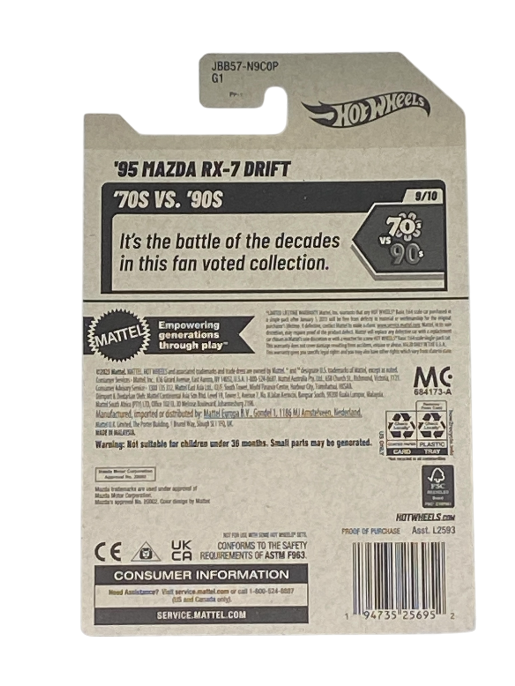 Ignite your collection with the stunning red Hot Wheels '95 Mazda RX-7 Drift from the '70s VS "90s Series 9/10! This iconic JDM legend captures the essence of '90s tuning culture with its aggressive wide-body kit, low stance, and flawless rotary-powered style. Perfect for Hot Wheels enthusiasts, Mazda fans, and die-cast collectors searching for premium detail in a 1:64 scale masterpiece.