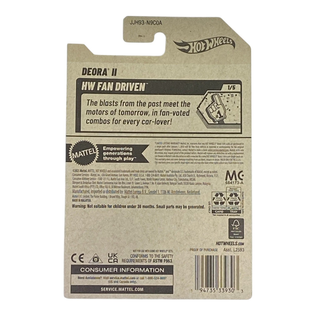 Discover the iconic Hot Wheels Deora II – the legendary surf-inspired fantasy pickup returns in a stunning fan-voted color as HW Fan Driven Series 1/5 in the 2025 Hot Wheels mainline collection. This modern remake of the classic Deora concept features dual surfboards in the bed, a front-hinged canopy door, bubble windshield, and supercharged V8 styling that's beloved by Acceleracers fans and Hot Wheels collectors hunting 2025 originals.