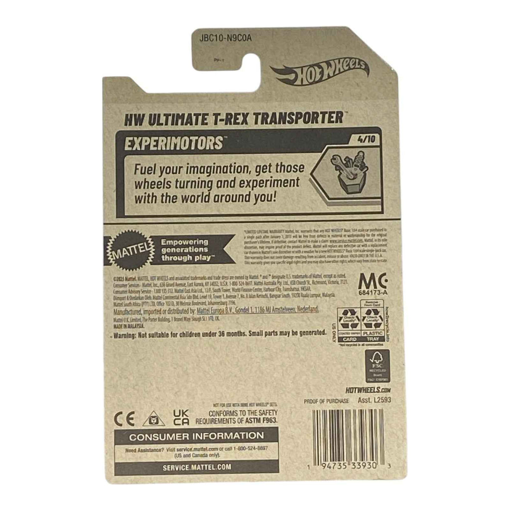 Unleash prehistoric chaos with the orange & teal Hot Wheels HW Ultimate T-Rex Transporter from the Experimotors Series 4/10! This 2025 mainline beast (#107/250) is a 1:64 scale die-cast mega-hauler with a ferocious T-Rex head that chomps, roars, and swallows cars whole, then spits them out the rear ramp for non-stop dino-powered launches. Vibrant orange body with teal accents, glowing red eyes, detailed scales, and massive black MC5 wheels deliver jaw-dropping style and smooth-rolling action on any track. Perfect for kids 3+ and collectors, it combines imaginative play, storage for 20+ vehicles, and display-worthy design. Search “Hot Wheels T-Rex Transporter 2025 orange teal” or “Experimotors dinosaur truck” to grab this must-have monster that turns every race into a Jurassic showdown!