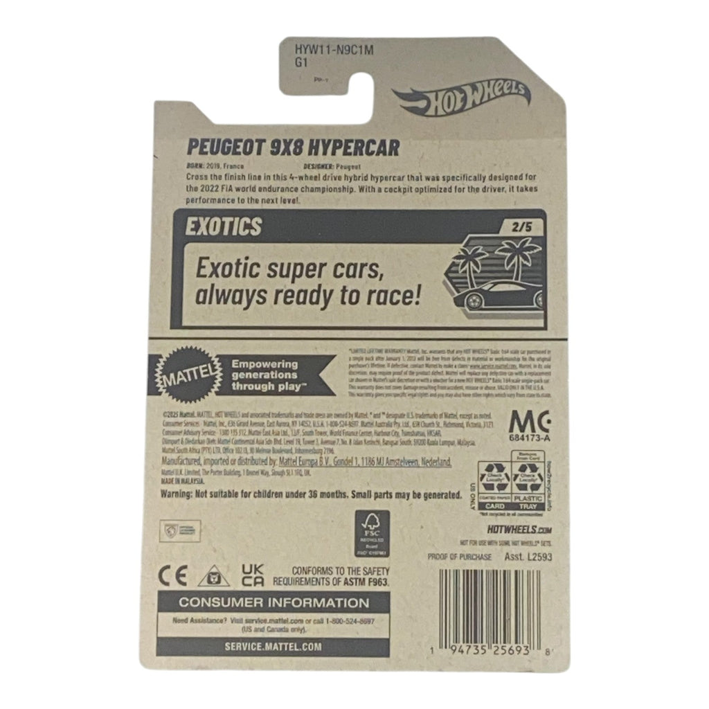 Ignite your passion for high-speed racing with the Hot Wheels Peugeot 9X8 Hypercar from the Exotics Series 2/5. This stunning 1:64 scale die-cast model captures the revolutionary design of Peugeot Sport's FIA World Endurance Championship contender, featuring its iconic wingless (or updated winged) aerodynamic profile, sleek white finish, and futuristic hypercar aesthetics that dominated headlines in 2024-2025. Perfect for Hot Wheels collectors, Le Mans enthusiasts, and die-cast aficionados searching for "Hot Wheels Peugeot 9X8," this 2025 release delivers premium detailing, rolling wheels, and collector packaging to elevate any display shelf. Whether you're hunting rare Hot Wheels exotics or building a hypercar collection, the Peugeot 9X8 Hypercar embodies cutting-edge motorsport innovation in miniature form—grab yours today and experience the thrill of endurance racing!