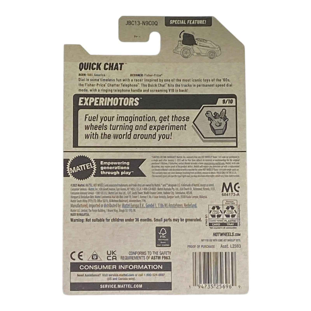 Dive into a world of whimsical speed and childhood memories with the grey and blue Hot Wheels Quick Chat from the 2025 Experimotors Series 9/10. This enchanting 1:64 scale die-cast vehicle reimagines the iconic Fisher-Price Chatter Telephone as a bobble-ready racer, complete with a silver-grey smiling face, piercing blue eyes, and a sleek blue base that evokes endless playtime adventures. Featuring a rear-mounted V10 engine, interactive ringing handle, and vibrant red accents on the seat and nose, it's a playful fusion of retro toy charm and high-octane Hot Wheels innovation – perfect for collectors hunting "Hot Wheels Quick Chat grey blue" or Experimotors gems. As #216/250 in the mainline, this first-edition standout from Case L sparks imaginative races, storytelling sessions, and display-worthy grins, blending Toy Story-inspired fun with premium detailing like rolling wheels and a chrome engine bay. Whether you're a die-hard Hot Wheels fan, Fisher-Price nostalgic, or parent seeking interactive toys under $5, the Quick Chat delivers giggles, speed, and collectible value in the thriving 2025 market, making it an irresistible addition to any shelf, track, or garage setup.