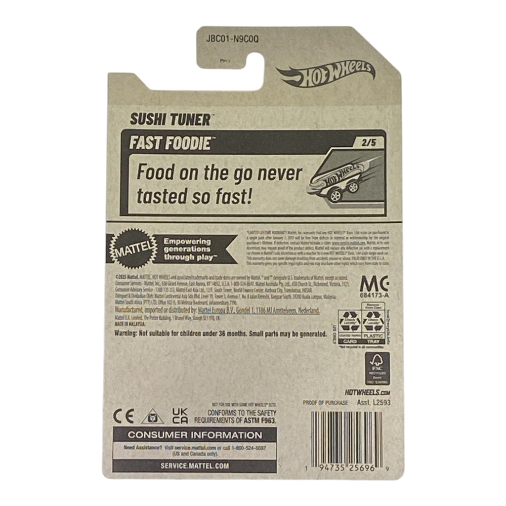 Discover the red Hot Wheels Sushi Tuner – a wildly creative 1:64 scale tuna sushi-shaped hot rod from the 2025 Fast Foodie Series 2/5 (#106/250 overall). This fan-favorite fantasy casting combines JDM tuner vibes with hilarious sushi theming, complete with chopstick holders on the roof, wasabi-green accents, and a glossy red "tuna" body that's perfect for Hot Wheels collectors chasing unique food-themed cars and 2025 mainline releases.