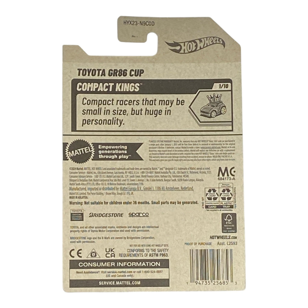 As a part of the Compact Kings series, the Hot Wheels Toyota GR86 Cup embodies the spirit of competition and fun. Ideal for both indoor and outdoor play, this model can easily become the centerpiece of your Hot Wheels collection. Race your friends or simply display it - the choice is yours!