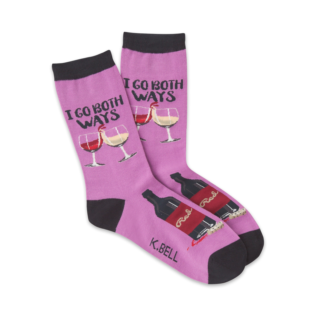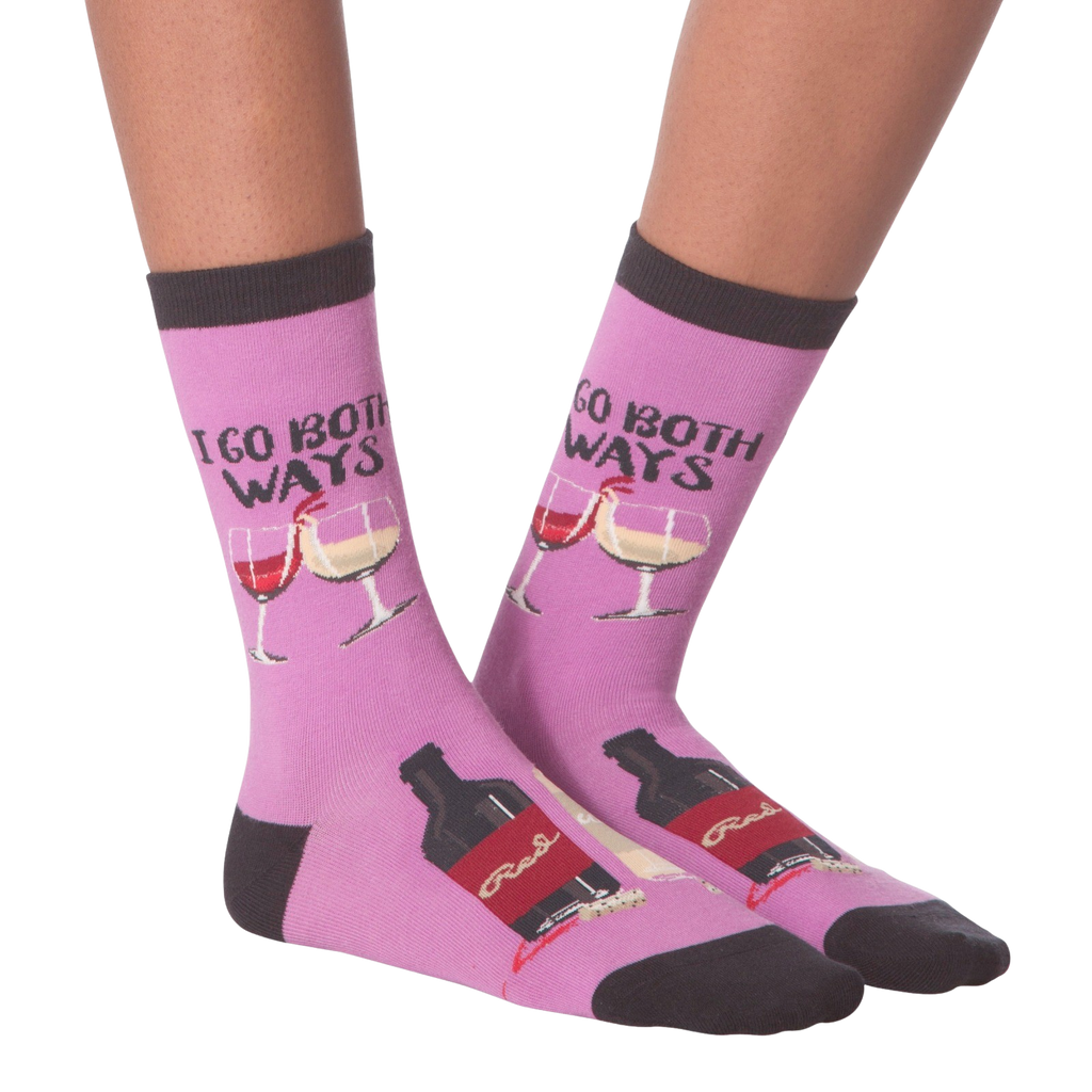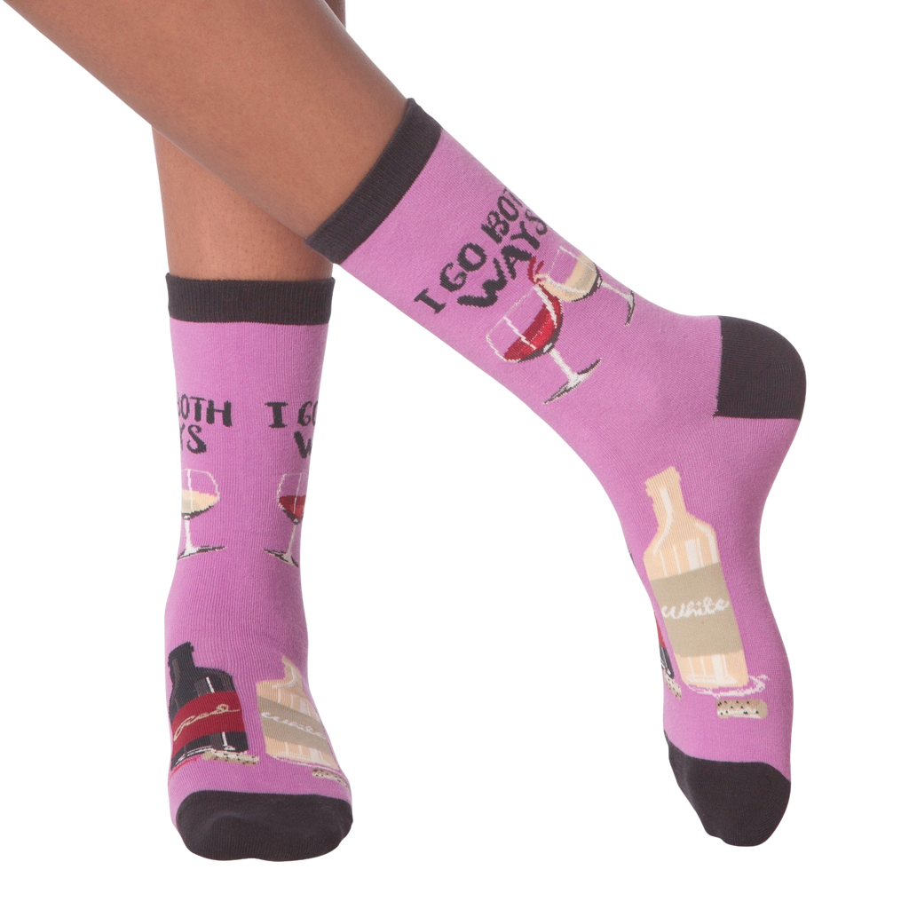 These purple crew socks say 'I Go Both Ways' in bold white lettering, with a picture of red and white wine glasses and a bottle of red wine. Like a good wine, these socks can be worn with both a casual and formal outfit, making them the perfect, lighthearted accessory to any wardrobe.