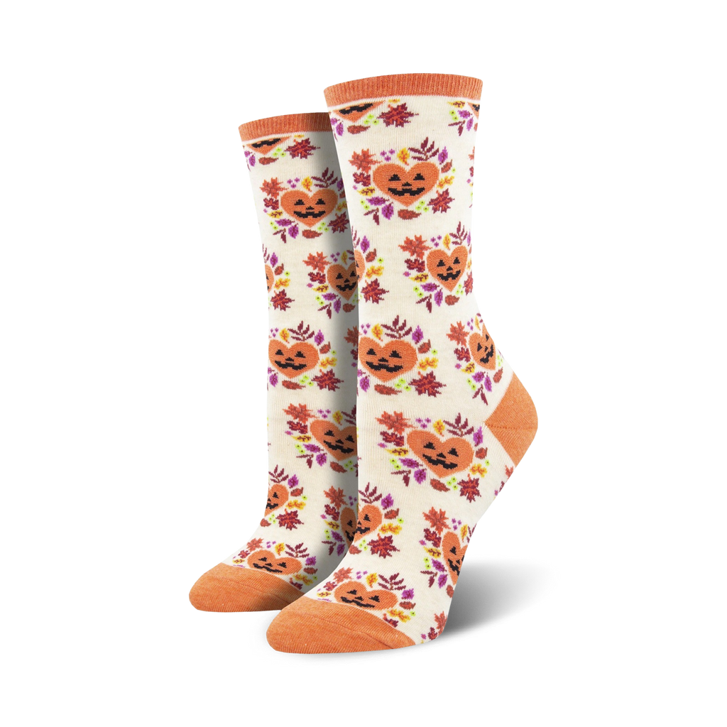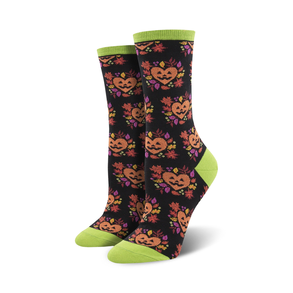 (50-80 word description): Fall in love with Halloween all over again with our I Heart Halloween socks! These spook-tacular socks have an all-over pattern of orange pumpkins with black stems and faces, decorated with small red hearts. The vibrant design is sure to bring a smile to your face and make a statement wherever you go. Made for women and reaching up to your mid-calf, these cozy socks are the perfect accessory for your Halloween wardrobe or a fun gift for your favorite ghoulish ghoul.