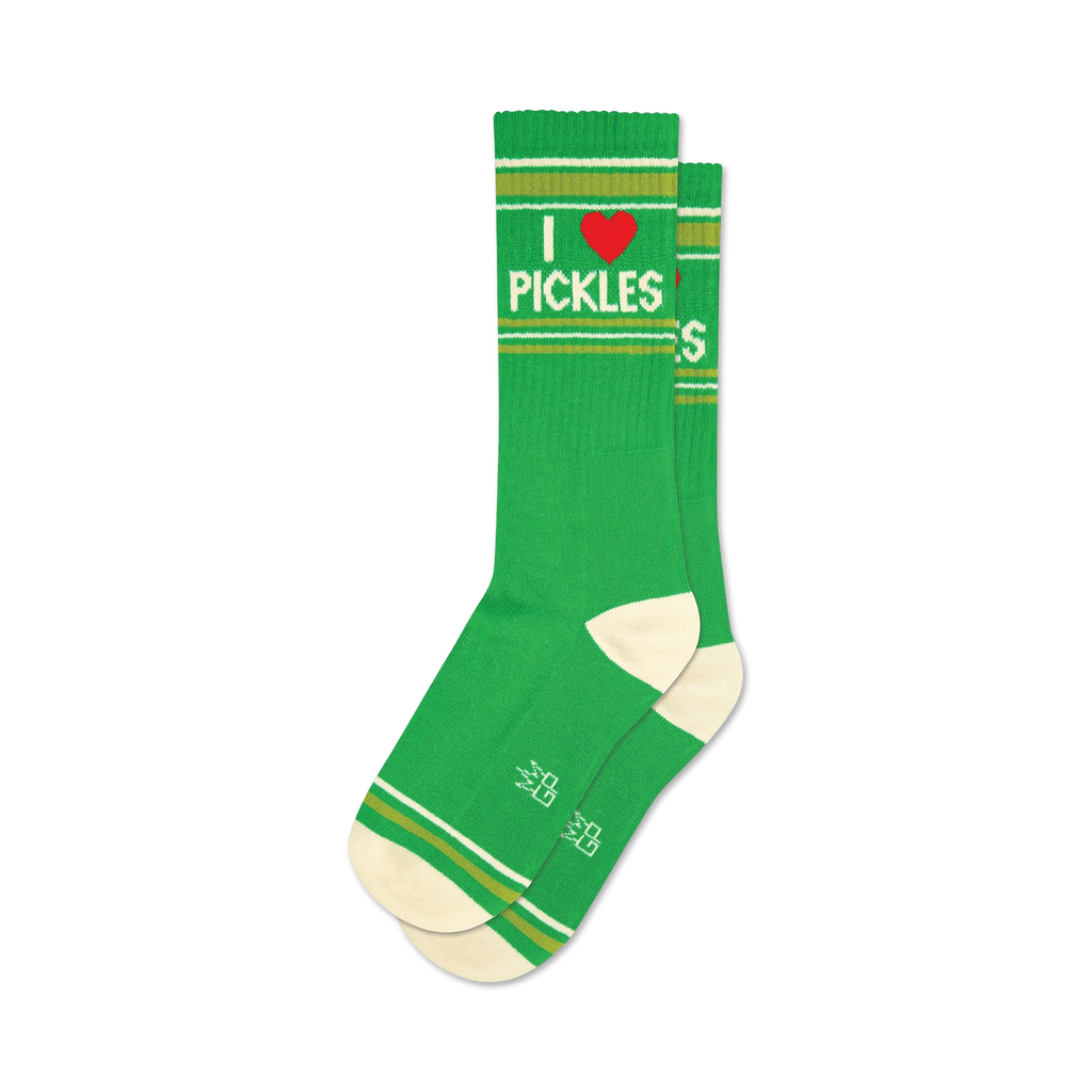Love those pickles! These I Heart Pickles socks give you a dilly of a good time. Topped with bright green with white accents and featuring a fresh red heart with 'I Heart Pickles' written above, you'll never dill-iver these socks. Show your love for this crunchy snack and pickle lovers will relish the humor. Wear your sole-food with pride!