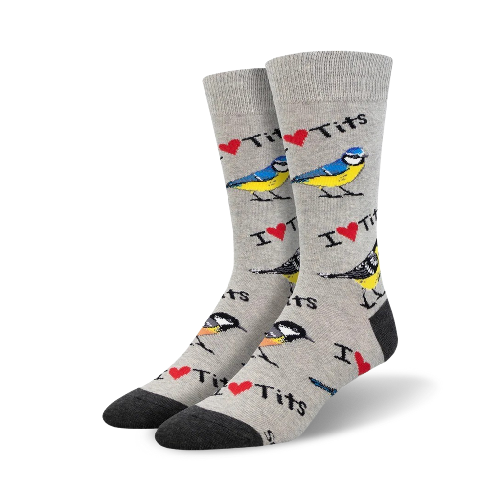Yo, peep these I Heart Tits socks! They're the bomb! Show off your love for those beautiful blue and yellow birds with these comfy crew socks designed just for dudes. Because who says guys can't love tits? Plus, did you know that a group of tits is called a "cast"? How cool is that! So, whether you're a birdwatcher, nature lover, or just a fan of fun socks, these I Heart Tits socks are sure to make you smile.