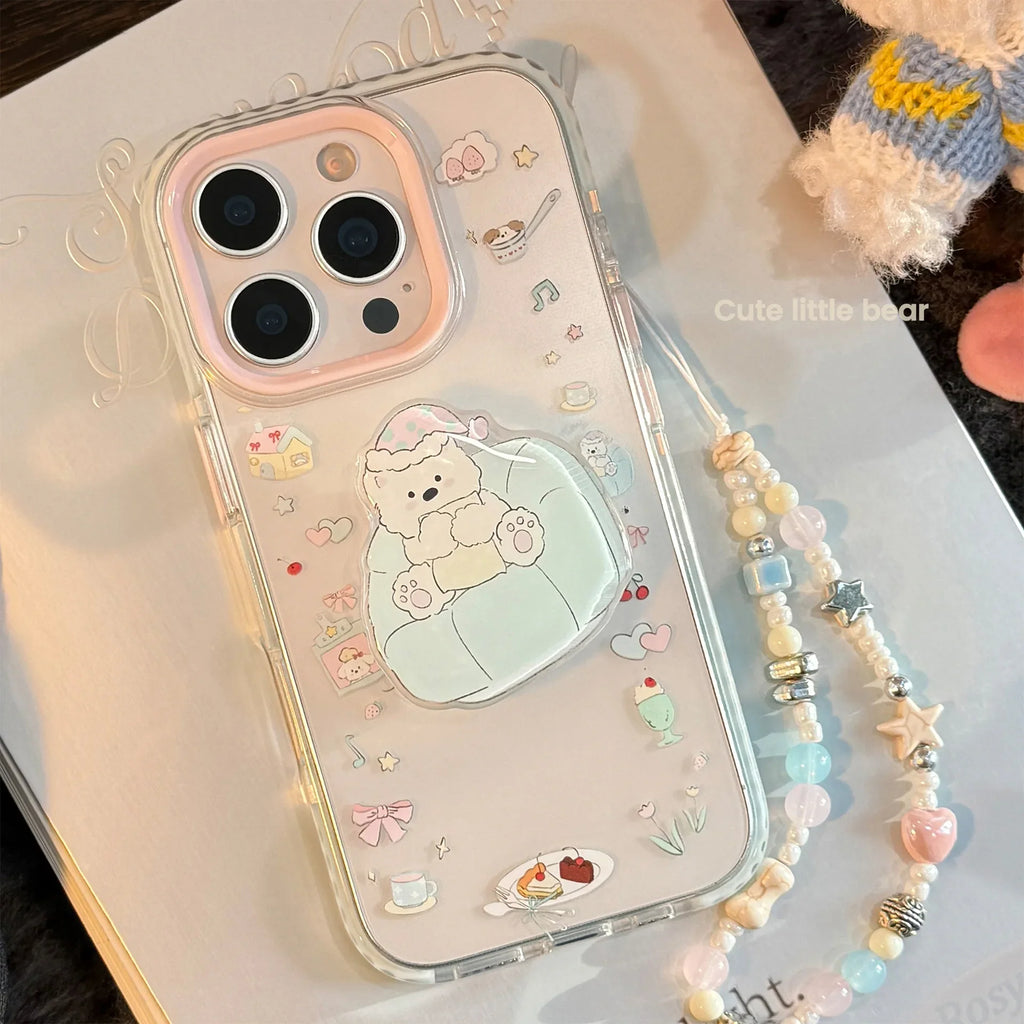 Protect your iPhone with playful style using this charming clear phone case featuring an adorable cartoon puppy lounging on a dessert-themed sofa. The transparent design showcases your phone's original color while the attached chain bracket offers convenient hands-free viewing and secure grip. Perfect for anyone who loves cute aesthetics and functional accessories, this case combines protection with personality. The durable construction safeguards against daily bumps and drops, while the eye-catching design makes your phone instantly recognizable. Elevate your phone protection game with a case that's as fun as it is practical.