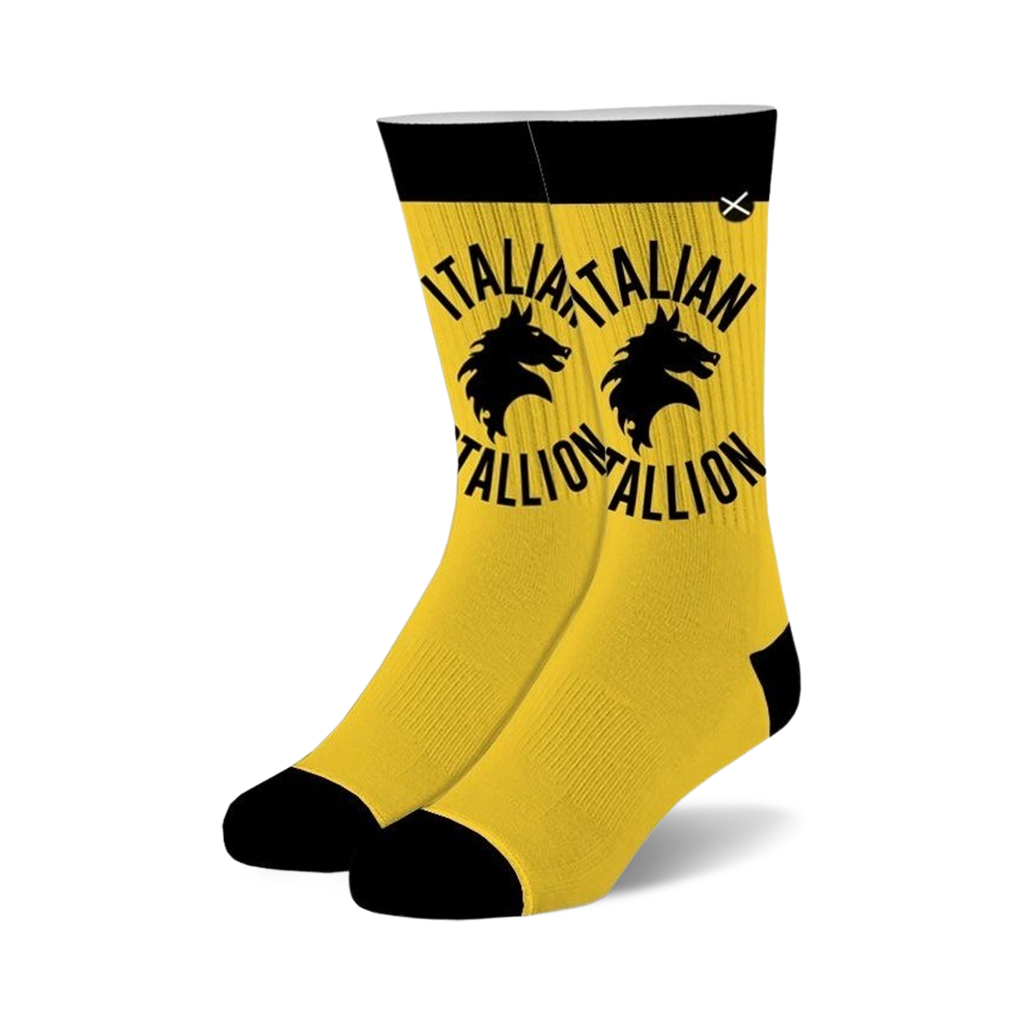 Channel your inner Italian Stallion with these striking yellow socks, emblazoned with the word 'Italian' on the front and the word 'Stallion' on the back. The vibrant black horse head in the middle of each word adds a dash of fierce charm. Whether you're a Rocky fan or just enjoy a pop of color, these socks are sure to leave everyone whinny-ing with delight.