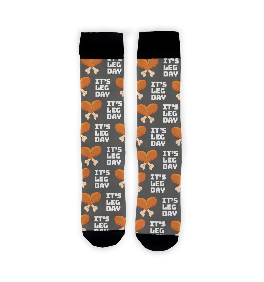 Attention, sock enthusiasts and pun aficionados! Introducing the It's Leg Day socks, where humor meets athleisure. Gray with a black toe and heel, these socks scream "drumstick workout!" The words "It's Leg Day" dance across them in orange and white, leaving no doubt about your fitness intentions. Get ready to strut your stuff and show off your appreciation for the tastiest part of the Thanksgiving turkey, the drumstick, while you work those legs. Whether you're hitting the gym, running errands, or just lounging at home, these socks will keep you comfortable and stylish while reminding you to work those legs and rock those drumsticks!