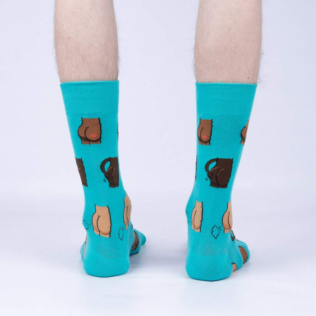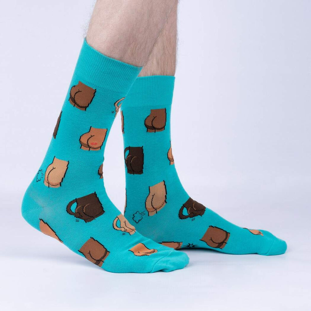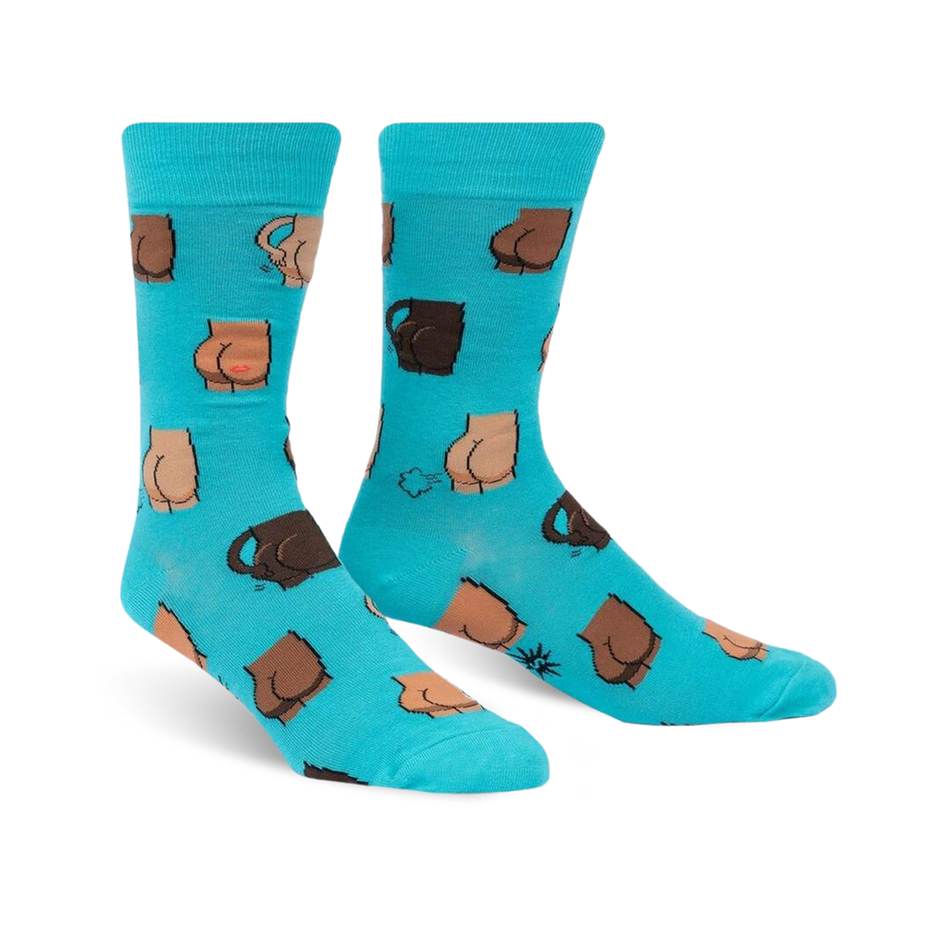 Get ready to make a statement with our "Kiss My" crew socks! These blue socks feature a hilarious pattern of cartoon butts in various shades of brown, sure to make anyone giggle. Put on a pair of these socks and prepare to be the center of attention wherever you go. Perfect for the man who loves a good laugh, these socks bring a touch of humor to any outfit.