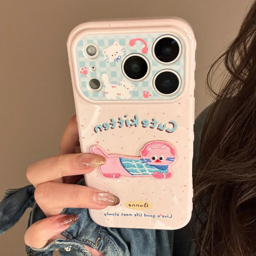 Bring playful charm to your iPhone with this adorable Korean-inspired phone case featuring a precious embroidered kitten design. The soft silicone construction provides reliable protection while the eye-catching pink splashed ink artwork and 3D details make a bold style statement. Perfect for cat lovers who want their phone to reflect their personality, this case combines cute aesthetics with practical durability. The cushioned material absorbs impact, keeping your device safe from everyday bumps and drops. Express your love for kawaii culture with a case that's as unique and lovable as you are.