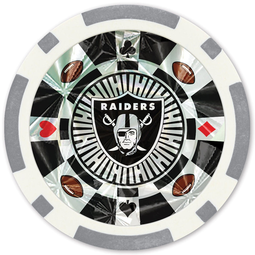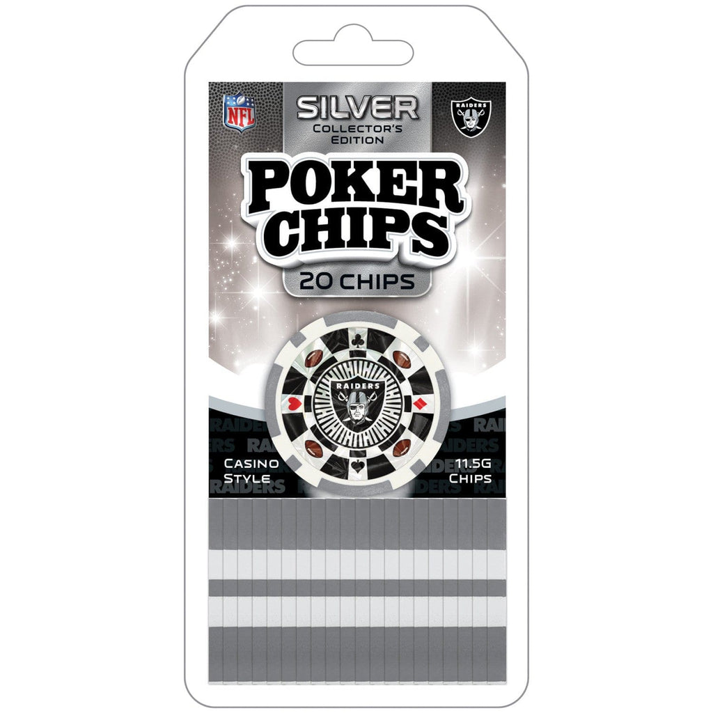 These Las Vegas Raiders poker chips are the perfect choice for all NFL Football fans! This Silver Collector's Edition set contains 20 casino-style chips. These poker chips are perfect for Texas Hold'em, Blackjack, tournaments, card clubs, and more!  Each metallic colored poker chip has a Raiders design on both sides.  Support your favorite NFL team with officially licensed and approved poker chips. Perfect for all fans!