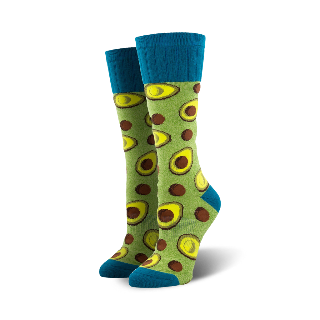 Meet Let's Guac and Roll, the av-sock-ado of socks! Picture this: A boot sock with an irresistible avocado print on a background of green. These socks for women can make even the blandest day extra. They're made for kicking back and adding some zesty fun to your daily routine. And the blue cuffs and toes? They'll have you saying, "Holy Guacamole!" every time you wear them. Get ready to take your feet on a flavor adventure!