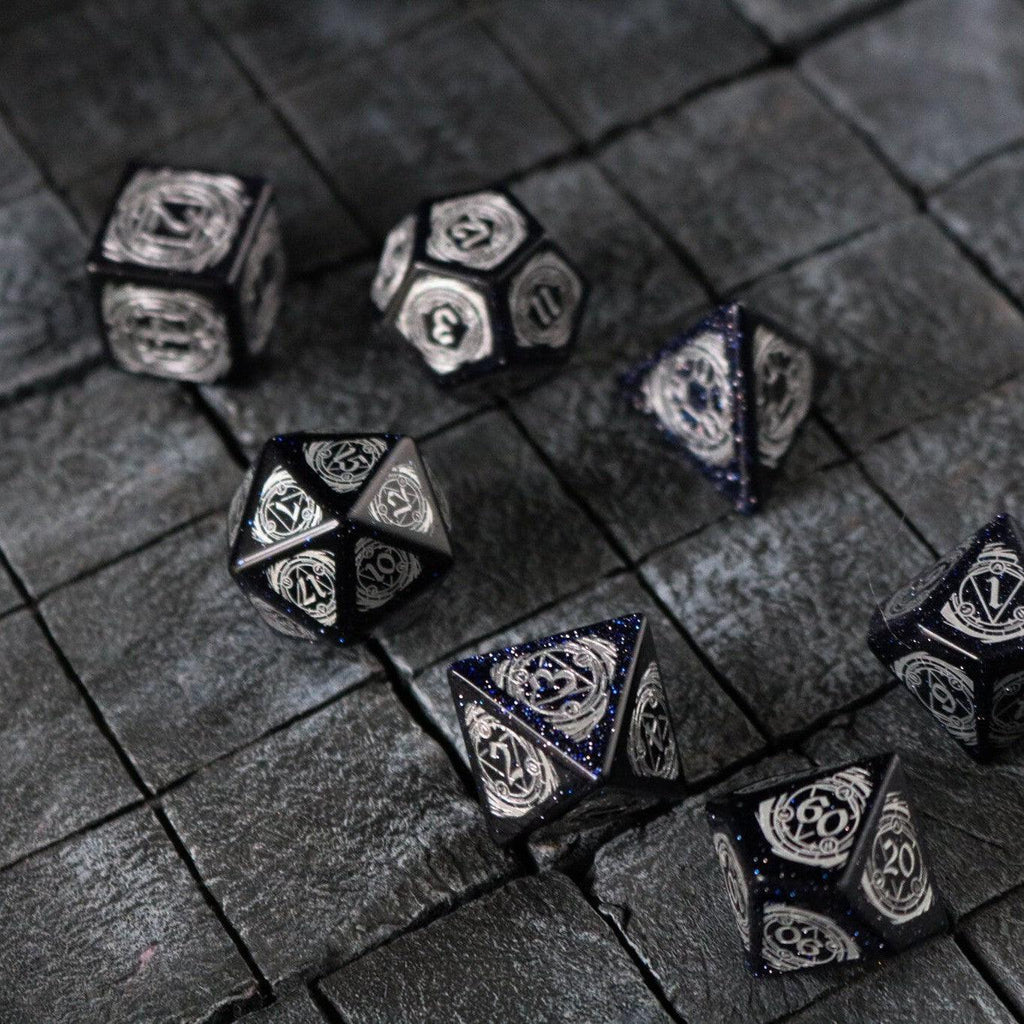Unleash your inner mage with the Mage Fury Blue Sandstone Silver Font Gemstone DND Dice Set, a mesmerizing collection hand-crafted from shimmering blue sandstone. Each die features silver font for easy reading and a unique pattern, capturing the essence of ancient magic and elemental power.