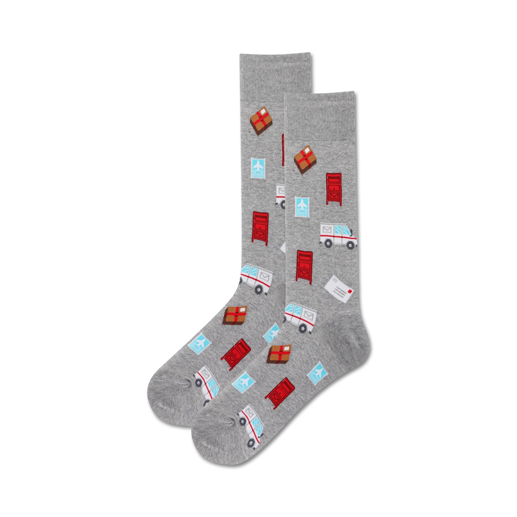 Mail Carrier Crew Socks: Step aside boring socks, these vibrant Mail Carrier Crew Socks are sure to deliver the fun. Featuring a playful parade of mailboxes, airplanes, speedy delivery vans, and packages, these socks will have you dancing through the day. Channel your inner postal worker and flaunt these kicks that are as dependable as the post office itself. Let your feet do the talking and make your sock game as reliable as the mail!