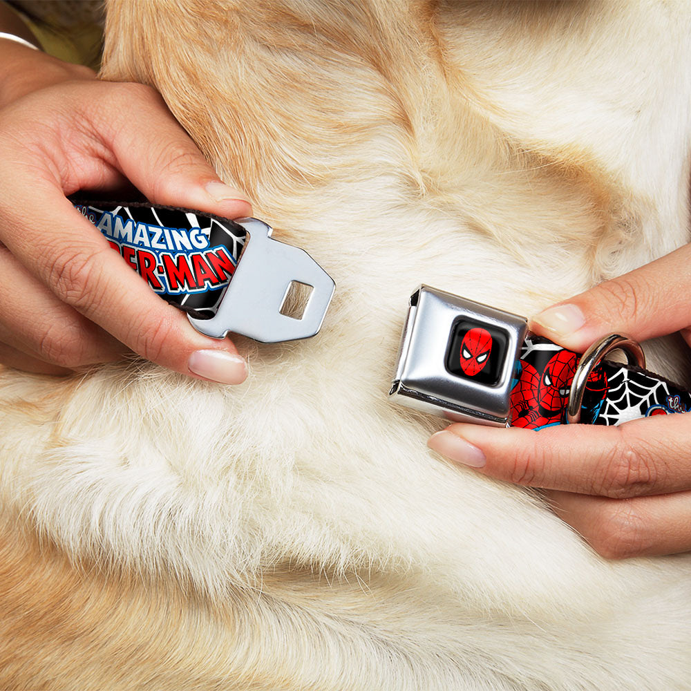 Your dog will be the talk of the town when people notice they're wearing this awesome SeatBelt Dog Collar! Made from high-density polyester and durable steel components, this collar is built to last. It features beautiful vibrant artwork. The buckle is a miniature authentic SeatBelt Buckle, so you press the center button to release the clasp. This product is Made in USA by Buckle-Down Inc. and officially licensed by Marvel Comics.