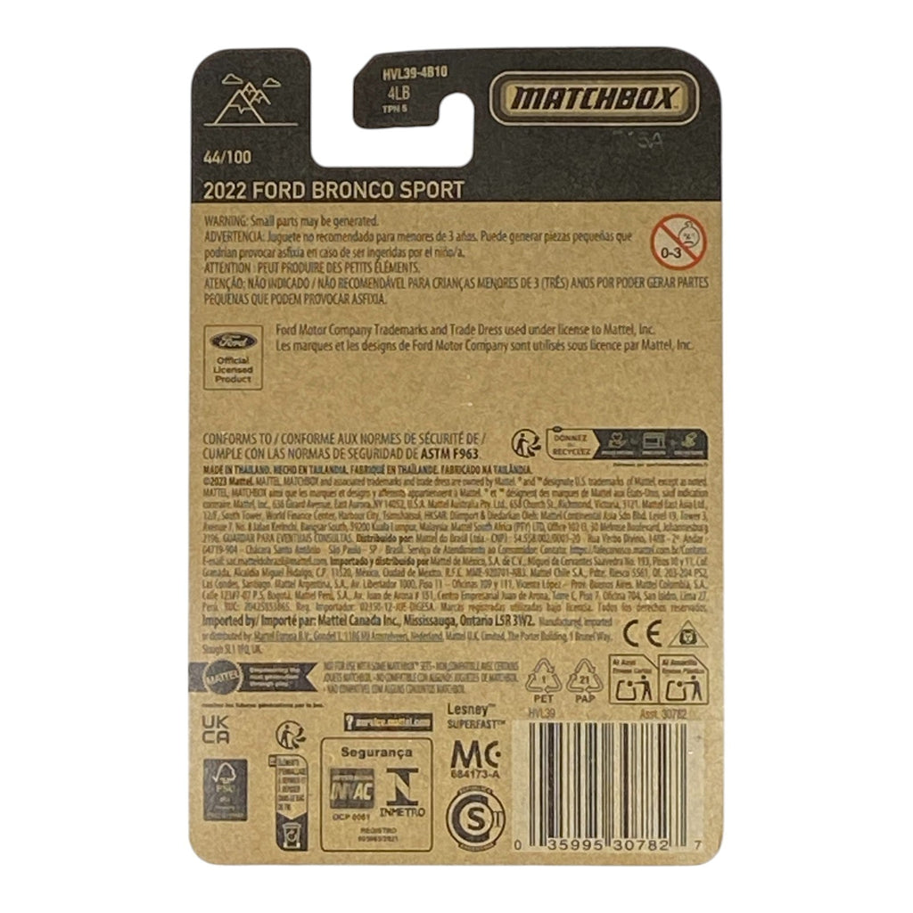 - **Authentic Design**: Crafted with precision, the Matchbox 2022 Ford Bronco Sport mirrors the actual vehicle's robust aesthetics.