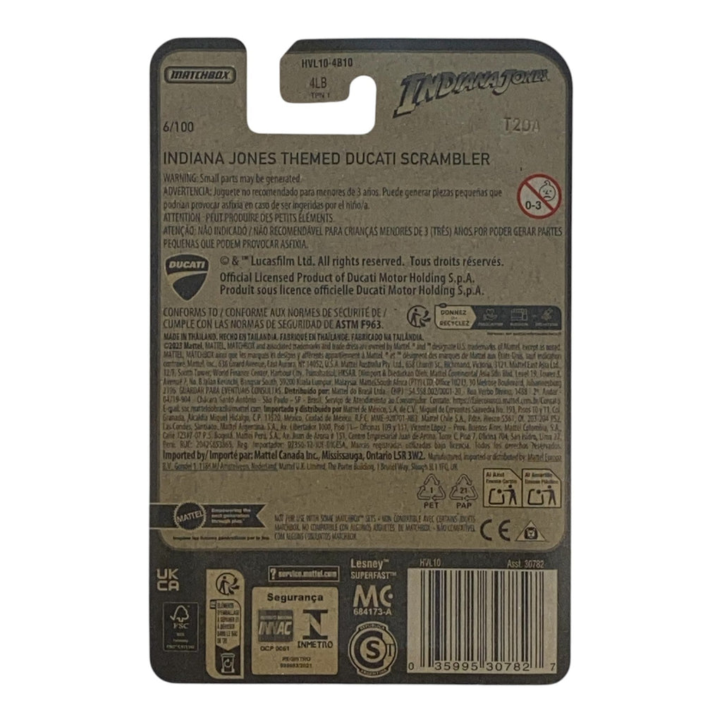 In conclusion, the Matchbox Indiana Jones Themed Ducati Scrambler is more than just a collectible vehicle; it's a symbol of adventure that tugs at the heartstrings of enthusiasts. Its blend of quality, detail, and homage to a beloved franchise makes it a necessary addition to both toy collections and Indiana Jones memorabilia alike. Don't miss the chance to own this remarkable piece that celebrates the legendary journey of Indiana Jones.