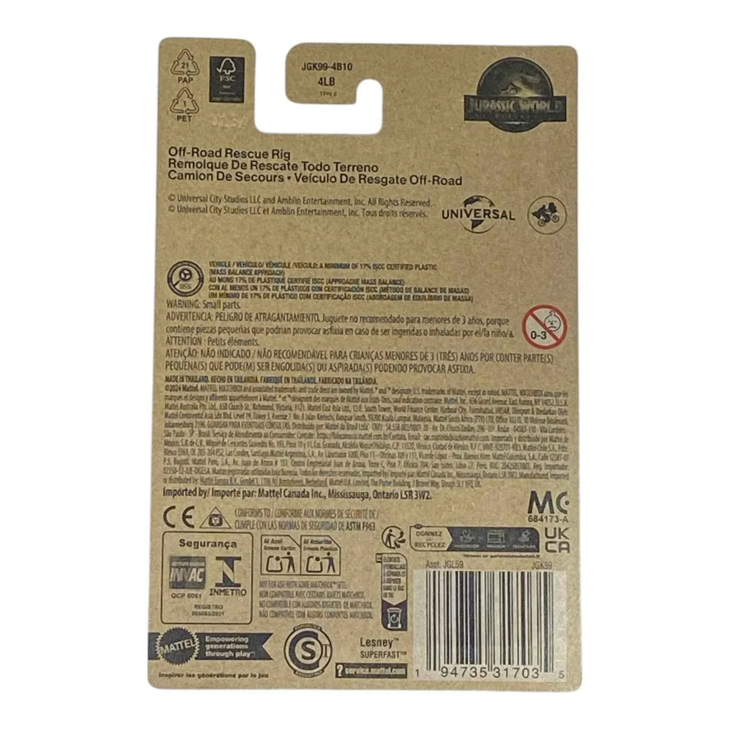 Deploy the ultimate lifeline with the Matchbox Off-Road Rescue Rig from the pulse-racing Jurassic World Rebirth Collection! This 1:64 scale die-cast beast features a massive six-wheel chassis, working winch, glowing emergency lights, and Rebirth-branded armor ready to tow raptors—or toys—out of danger. Perfect for Jurassic World collectors and young rescuers, it connects with Matchbox tracks, carries smaller vehicles, and survives volcanic playtime. Search “Jurassic World Matchbox rescue truck” now and save the park in epic style!