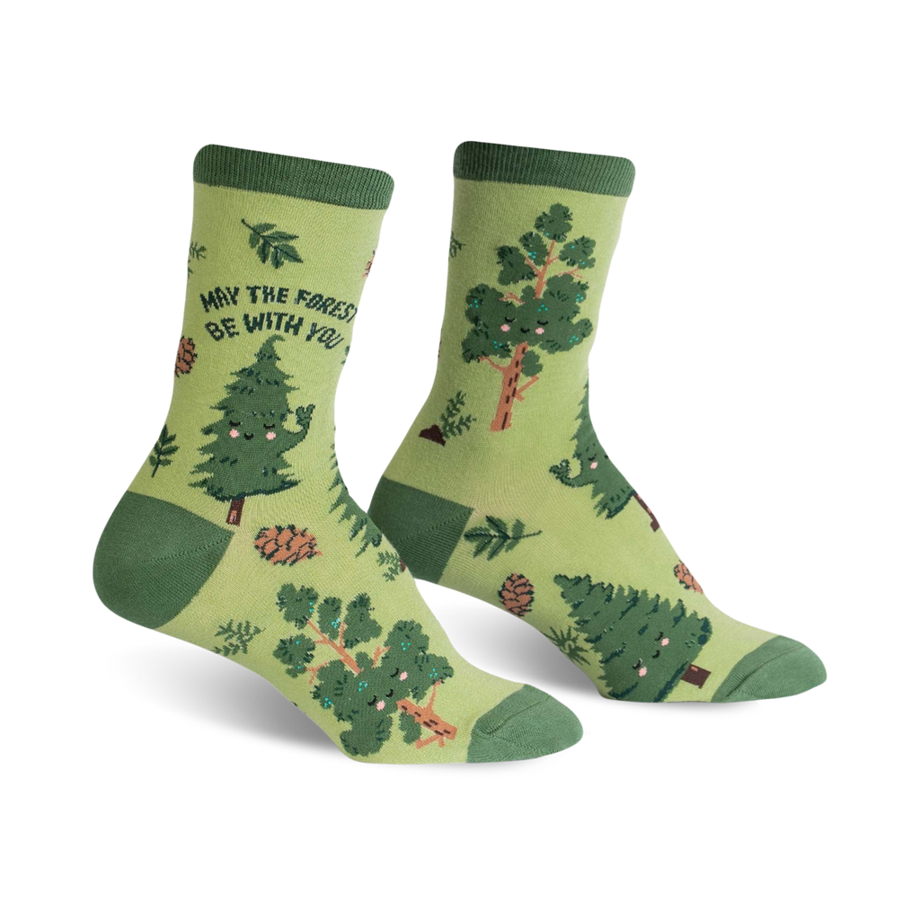Slip into the wild, funky world of May the Forest Be With You socks! These crew length socks are the perfect companion for any outdoor adventurer. Whether you're hiking, camping, or just kicking back by the campfire, these socks will have you looking like a forest ranger in no time. Just beware of Bigfoot trying to steal them!