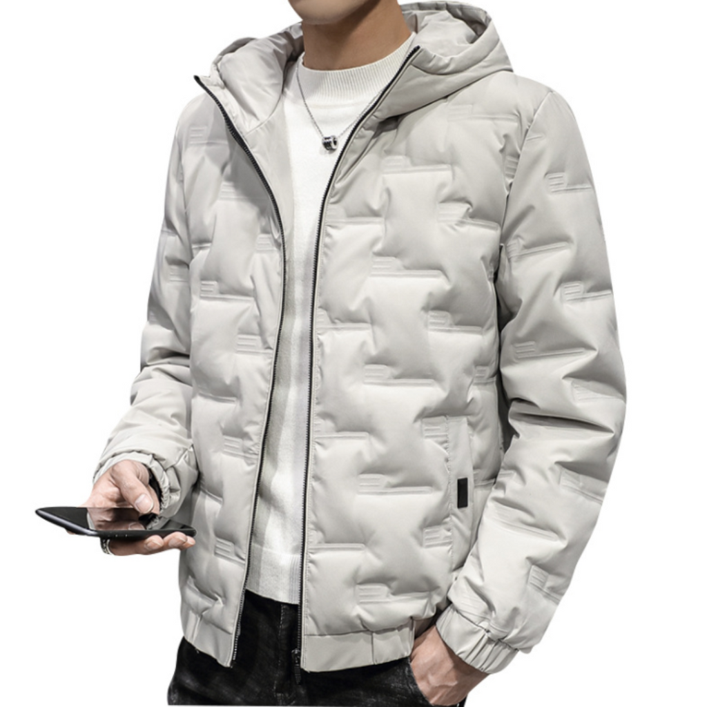 This hooded zipper jacket is not only trendy but also light and warm.  It comes in Black, Blue and Light Gray, from XS to L.