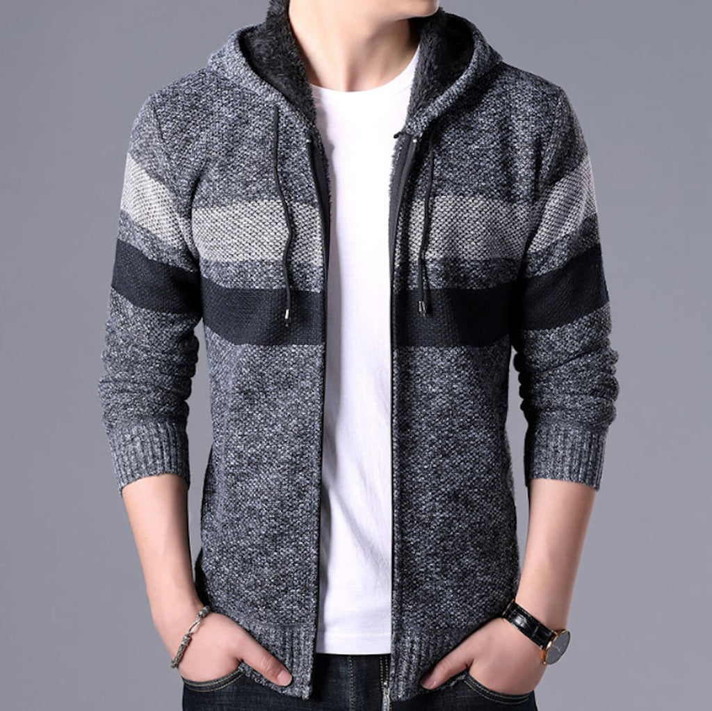 Mens Striped Knit Cardigan with Hood. Trendy and stylish. Easily match with your daily outfit