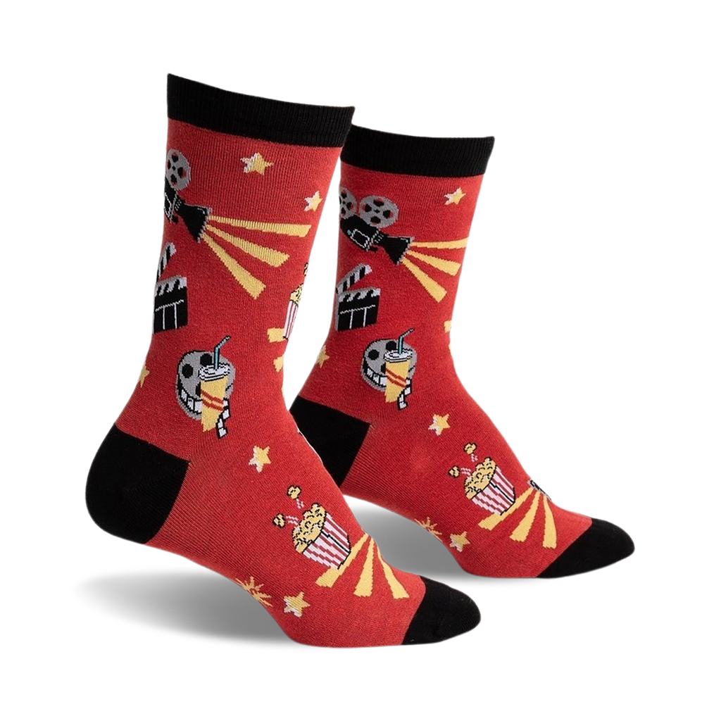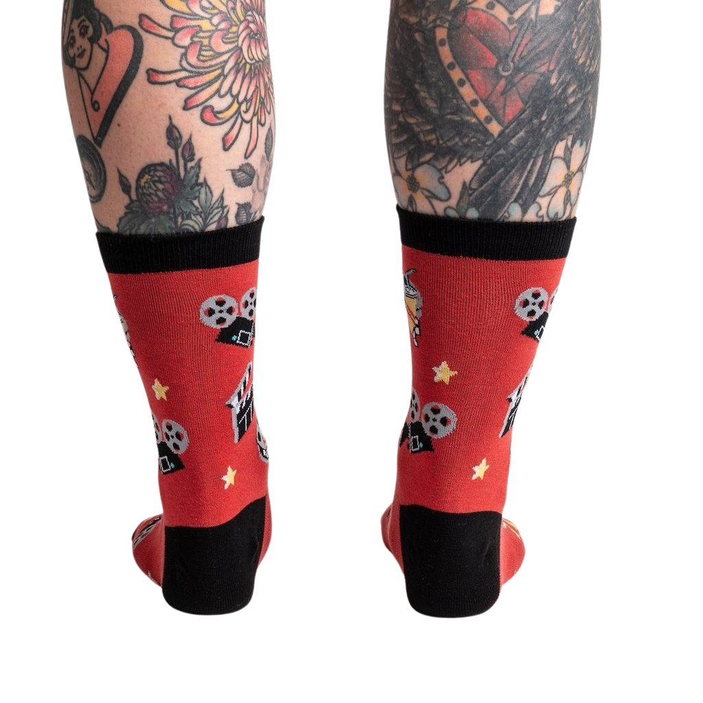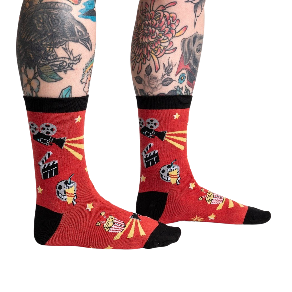 Get ready for a cinematic experience on your feet with our Movie Night Crew Socks! These red socks are bursting with popcorn, cola, stars, clapperboards, and projectors, making them the perfect accessory for any movie buff. Put on a pair and let the film festival begin! Fun fact: Popcorn was once considered a luxury food and was served at special occasions like weddings!