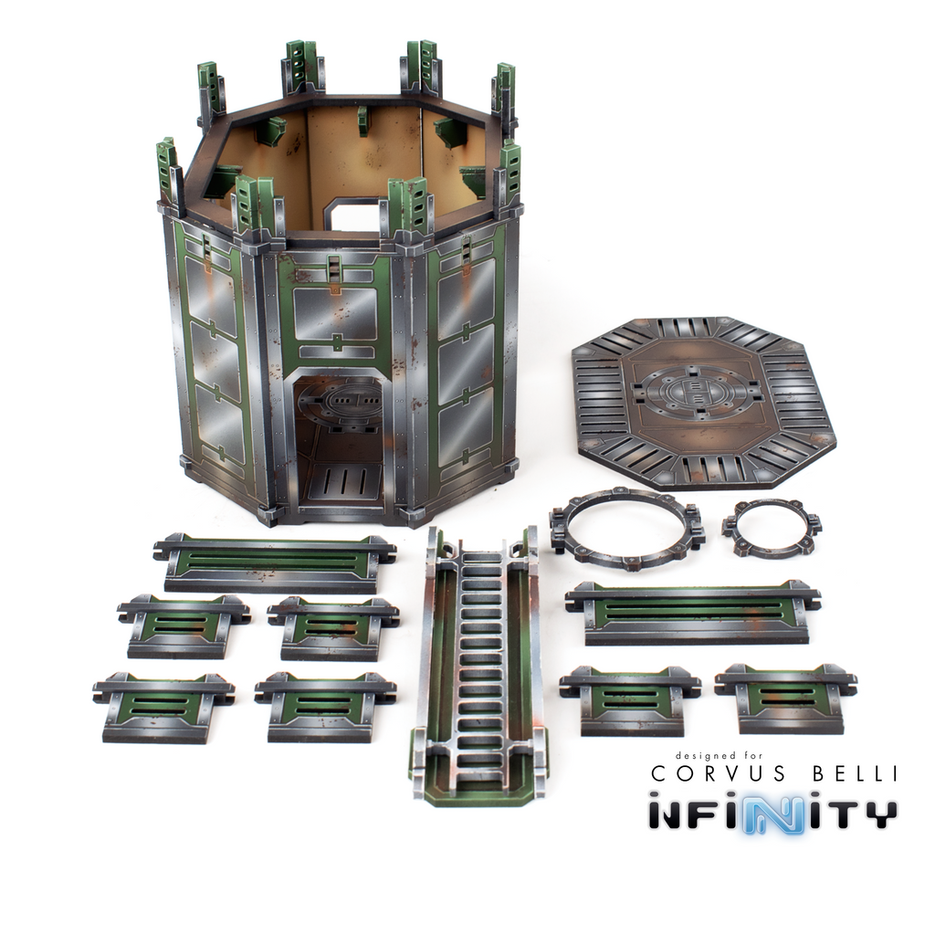 The Bastion works as a tower to connect the various wall and rampart sections of the MT. Zion terrain set. It has two wide gates and two narrow gates leading to a playable interior with a removable roof. The Battlement at the top has 6 wall connection points and two rampart connection points. The angled connection points allow a variety of choices when connecting the building and the numerous doors allow access through the wall for playability.
