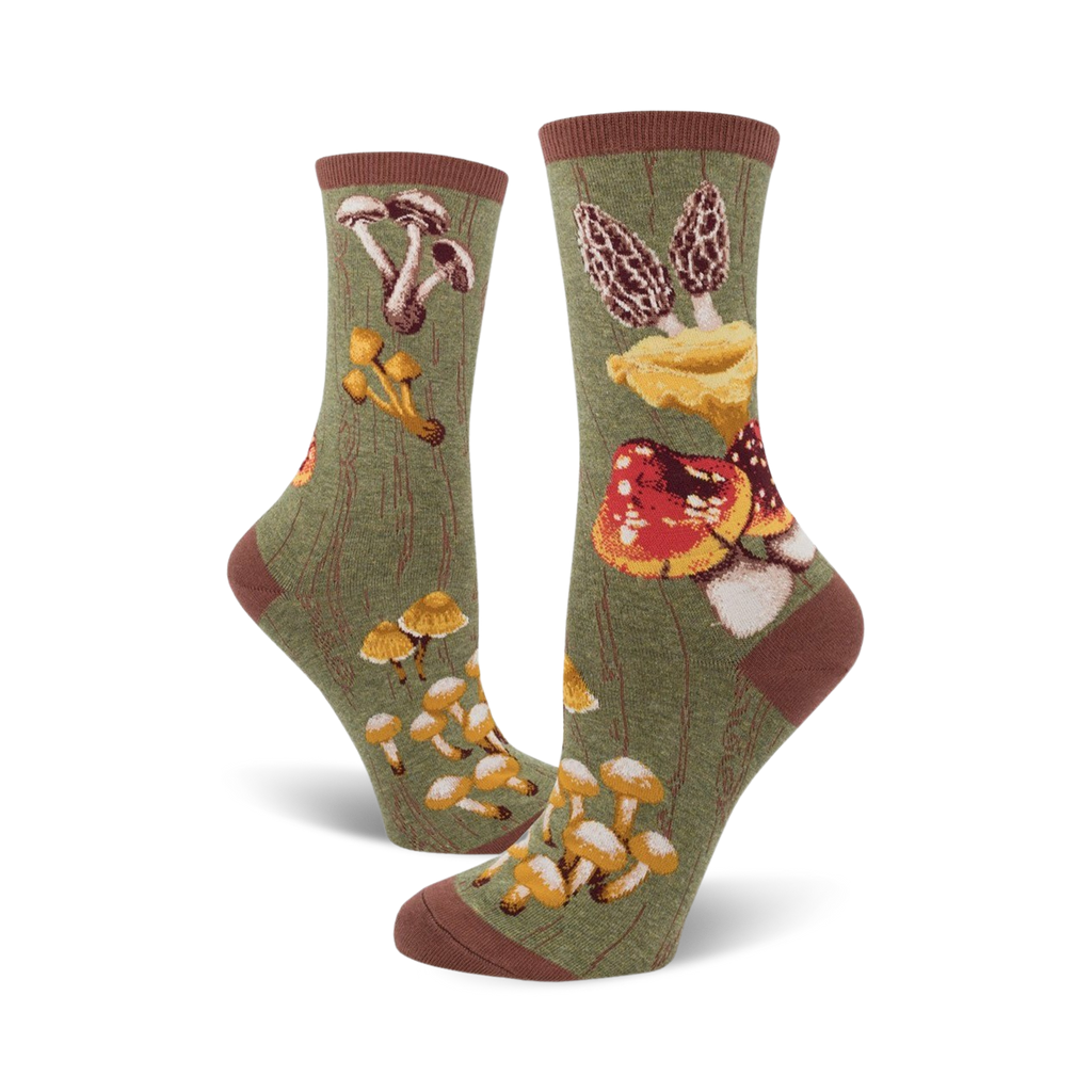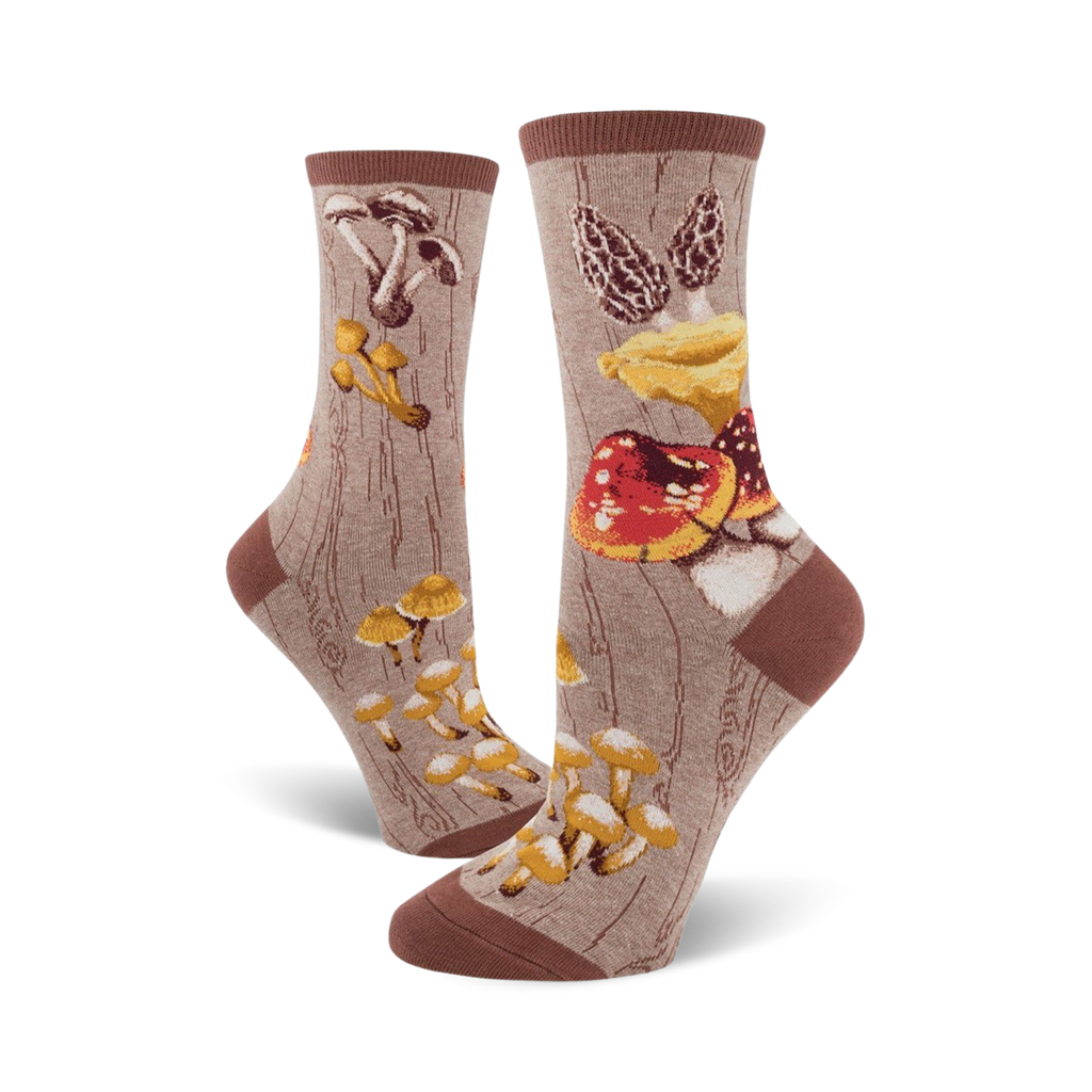 Mush-Room to Grow: Show off your inner fungi with these crew socks flaunting vibrant mushroom motifs on a backdrop of earthy brown. Nature's beauties in shades of red, orange, yellow, purple, and white dance across the fabric, while a tan tree trunk adds a touch of the forest floor. Step into a world of whimsical enchantment with every wear.