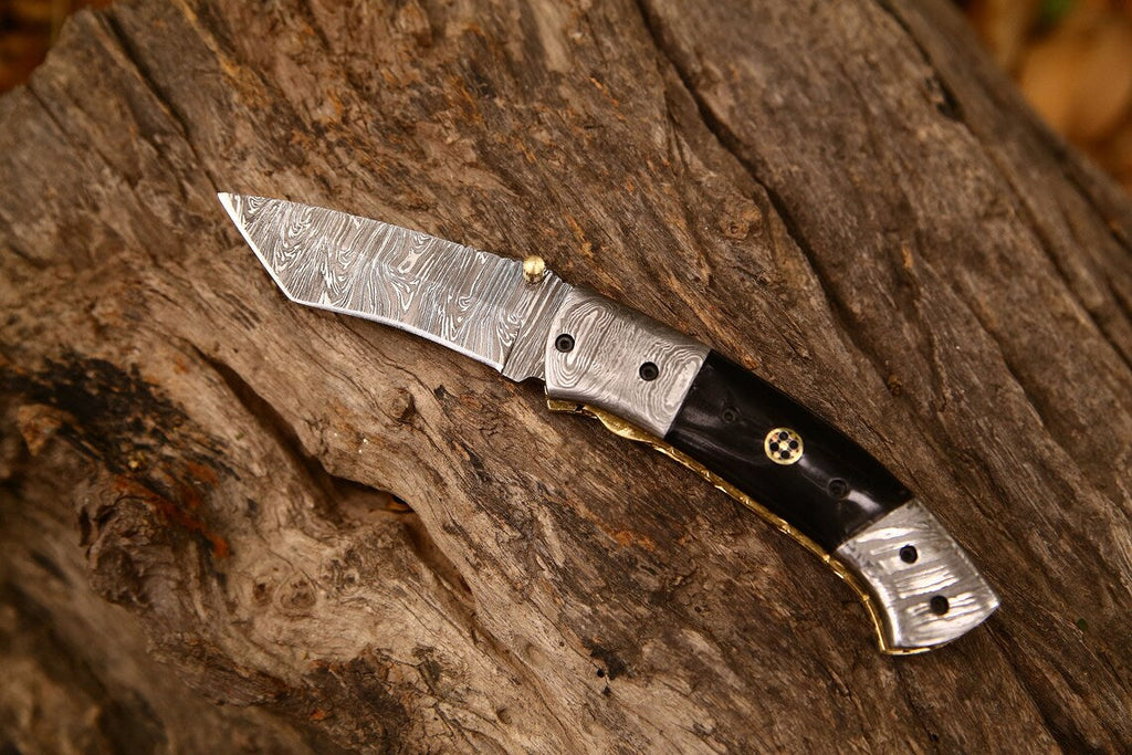 Introducing the New Custom Handmade Damascus Steel Tanto Blade EDC Folding Pocket Knife for sale by KBS Knives. This meticulously crafted knife features a 3-inch tanto blade forged from high-quality Damascus steel, renowned for its exceptional strength and distinctive patterns. The handle is made from robust buffalo horn, complemented by Damascus steel bolsters, providing both elegance and durability.
