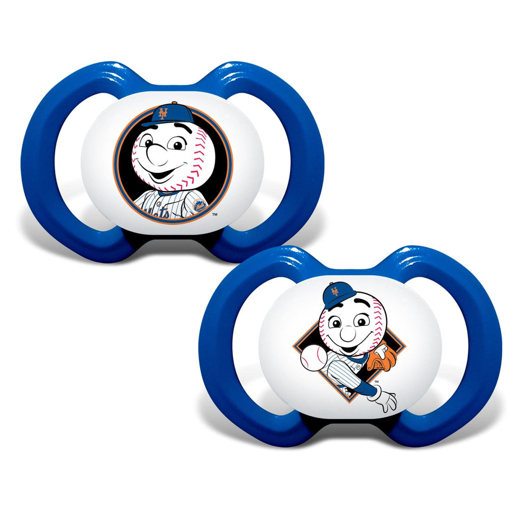 Looking for a way to soothe your little New York Mets fan? Look no further than these officially licensed MLB New York Mets pacifiers. The Orthodontic Silicone Nipple and plastic shield make them safe for your child's mouth, while the Team Logo And Colors on the "button" and shield respectively let everyone know who they're rooting for. These pacifiers have been quality and safety tested to be 100% BPA-free and are suitable for infants ages 3 months and up. To clean, use hot water and mild detergent and rinse thoroughly. WARNING: Do not tie the pacifier around the child's neck as it presents a strangulation danger.
