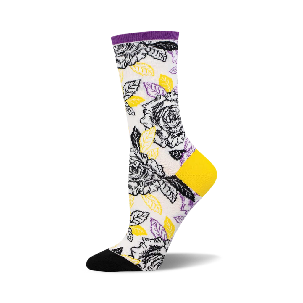 Flaunt your feet with our show-stopping Nonbinary Roses socks! Picture this: a playful tumble of black and yellow roses intertwined with lush green leaves, all perfectly made to pop against a crisp white backdrop. The black toes and heels add a dash of mystery, while the purple tops wrap up the look with a royal finish. Whether you're lounging at home, spicing up your office attire, or stepping out for a fancy soirée, these socks are your go-to for adding a touch of whimsy and a splash of color. So, why settle for ordinary when you can bloom in style at your next event with our enchanting floral crew socks? Go ahead, let your socks do the talking!