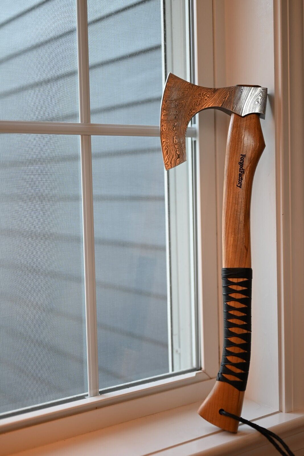 Embrace the power of ancient warriors with the Odin's Edge Norse Axe from KBS Knives Forged Factory. This exceptional axe features a custom handmade forged Damascus steel blade, renowned for its unparalleled sharpness and durability. The handle, crafted from ash wood and wrapped in leather, ensures a comfortable and secure grip, making it ideal for both combat and practical use. With a Rockwell Hardness of 55-60 HRC, the blade combines strength and resilience for consistent performance. Each axe is accompanied by a premium leather sheath for protection and convenience. Perfect for everyday tasks or as a collector's piece, "Odin's Edge" stands as a testament to craftsmanship and tradition.