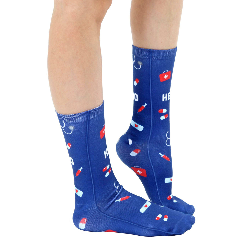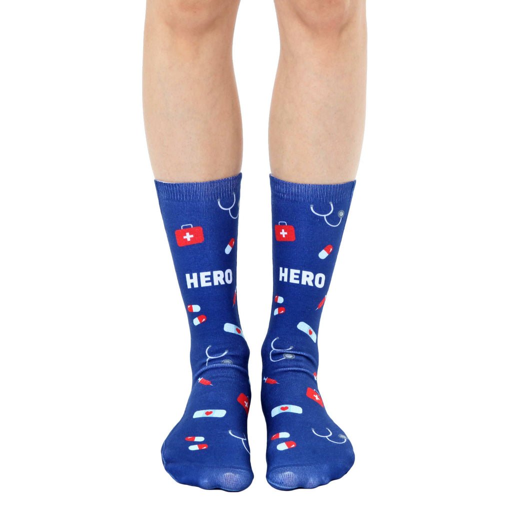 Calling all medical heroes! These Nurse Hero socks are the perfect way to show off your love for all things nursing and medical. With a cheerful pattern of red, white, and blue pills, hearts, stethoscopes, and plus signs, these socks will turn heads wherever you go. And with the word "HERO" emblazoned down the side, there's no doubt about your dedication to patient care. Whether you're a nurse, doctor, or just a medical marvel yourself, these socks are a fun and stylish way to show your appreciation for the heroes in scrubs. Don't let your feet look bland; cure your sock boredom with a pair of Nurse Hero socks today!