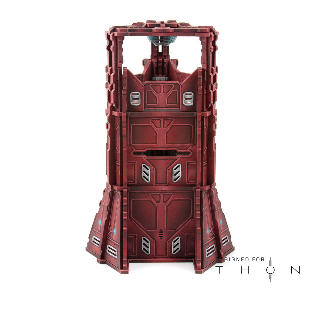 The Ordhren Drop Tower is a versatile, modular defensive structure that facilitates a plethora of battlefield functions. It can be dropped in sections to create a dispersed group of hard cover-structures or combined one atop the other to create guard towers and vantage points. It can also serve as a nexus for the many Acquiry Relay Stations, gantries and walkways that connect the various buildings virtually and physically.