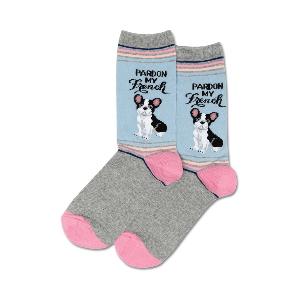 Pardon My French Crew Socks: Womens Crew Socks got a basic makeover! All the joy of owning a French Bulldog without the mess or veterinary bills.Pardon My French socks are adorned with a cute little French Bulldog who clearly has just told a racy joke. Perfect for fans of dogs or punny novelty sock lovers. If you're looking for a way to add some fun to your everyday wardrobe, these Pardon My French socks are the perfect choice.