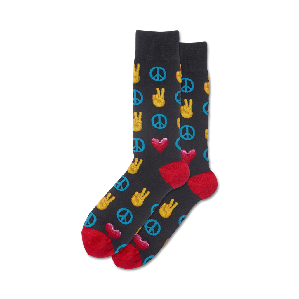 Peace and Love: For the Peace Keeper or Peacemaker in Your Life. Crew socks blasted with iconic symbols of peace, love, and unity. Patterns of blue and yellow peace signs, bright red hearts, and yellow peace hands bring a groovy vibe to these comfy socks with the power to spread joy, promote goodwill, and bring people together. Represent your belief in the goodness of humanity and the strength in unity. Wear your Peace and Love socks with bold style and bring a wave of positivity wherever you stomp and strut!