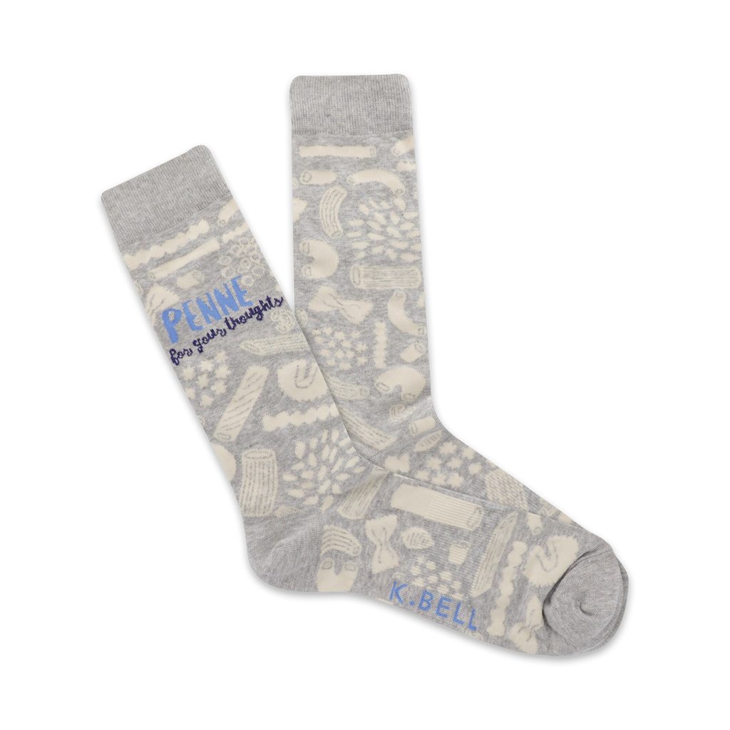 Pasta al dente! Strut your love for pasta and puns in these inspired gray Penne socks! Adorned with a pattern of delectable penne and the phrase "Penne For Your Thoughts," they're sure to inspire compliments and maybe even cravings from fellow Carb-oholics. Don't be surprised if someone asks if they can "borrow" a pair!